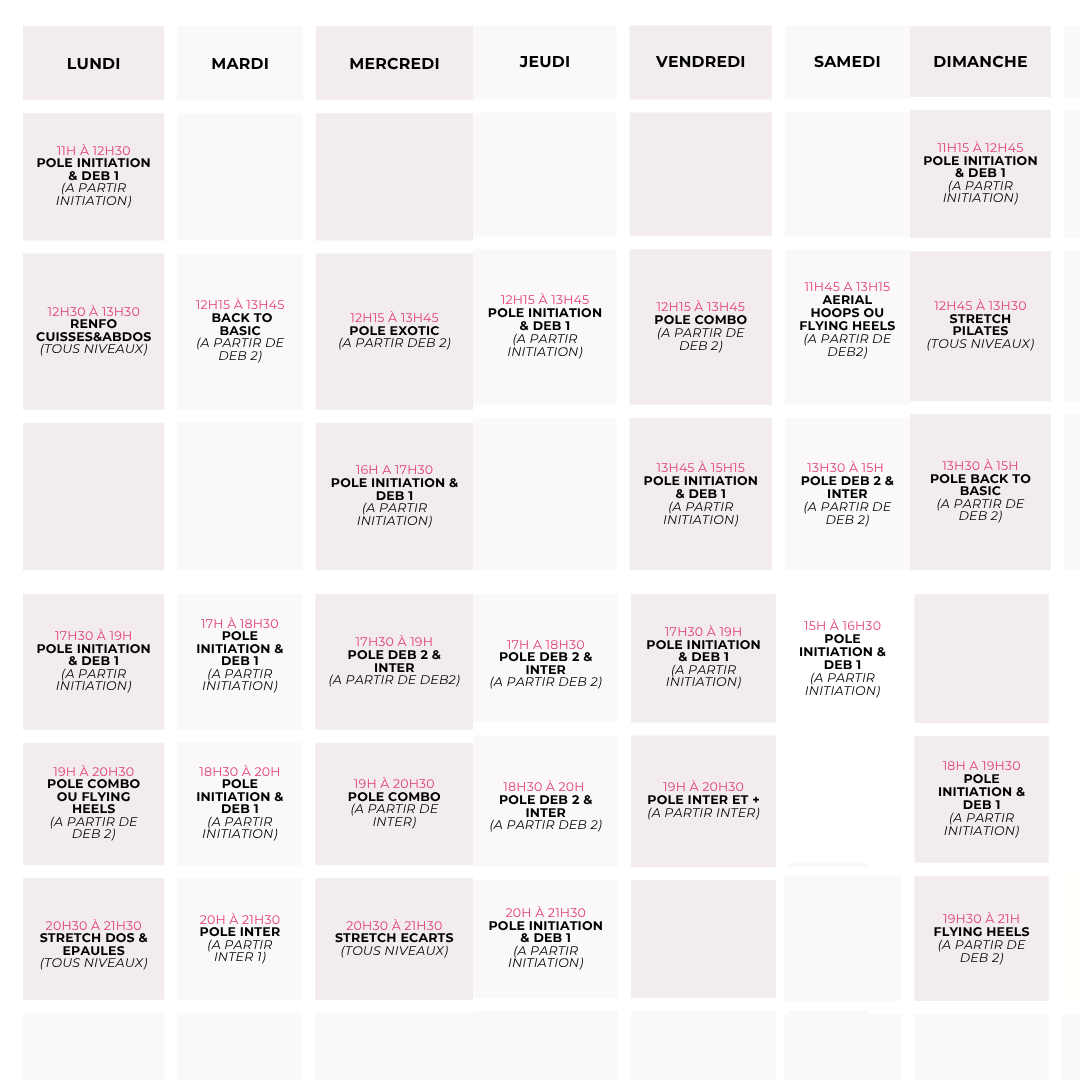 Ils se déroulent dans une ambiance conviviale et détendue avec 20-25min d’échauffements, 1h de pole dance, 5-10min d’aétirement pour les cours d’1h30.